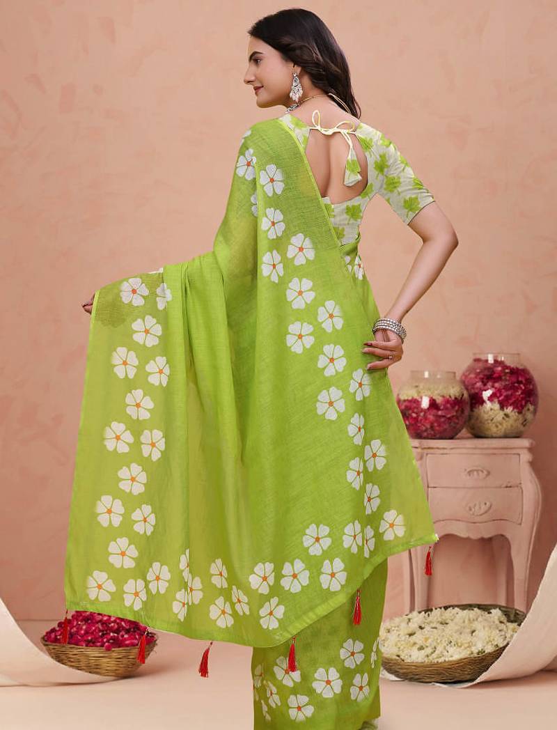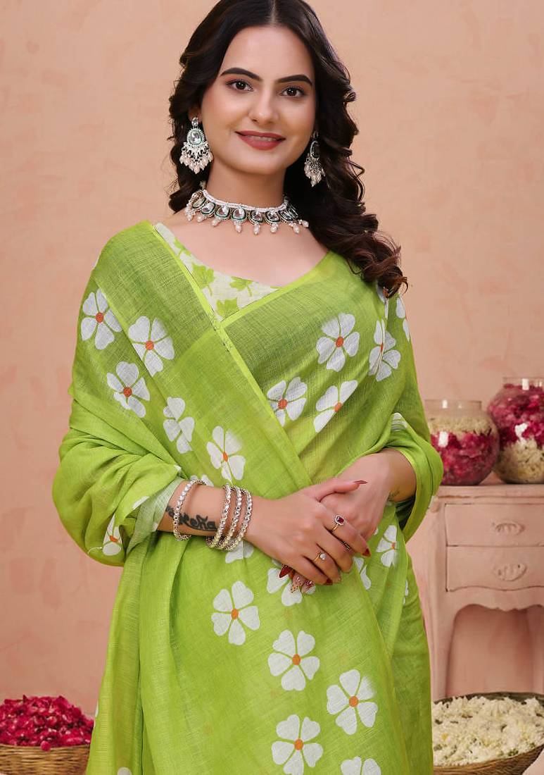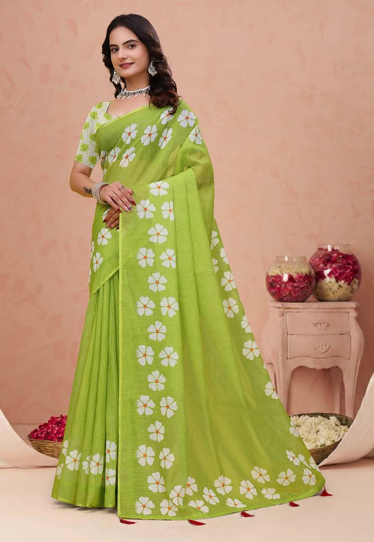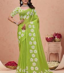Parrot green printed art silk designer pallu saree