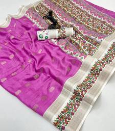 Pink soft tussar silk saree with zari butti & kashmiri style woven border