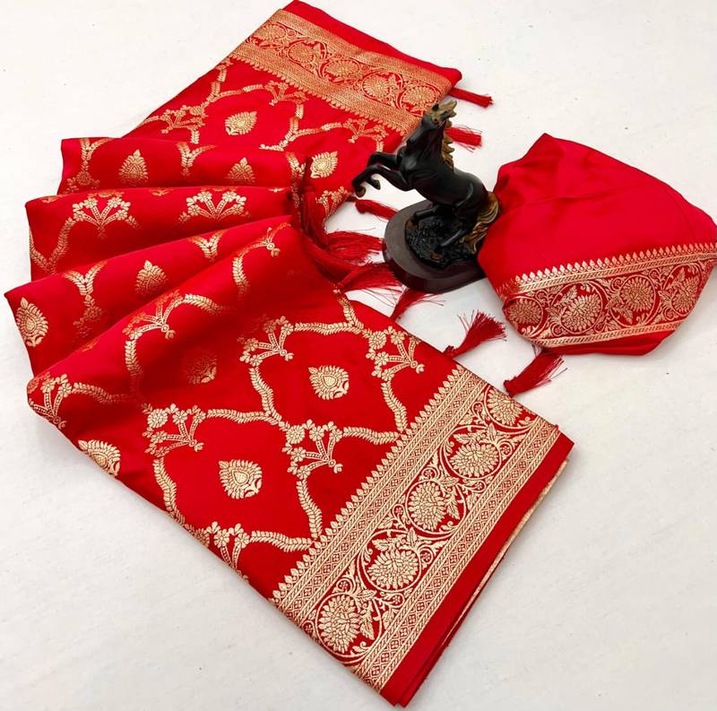 | Product Name | Red Banarasi Satin Mashroo Silk Saree With Multicolor Zari Motifs | |