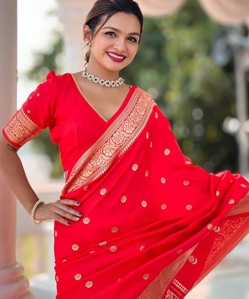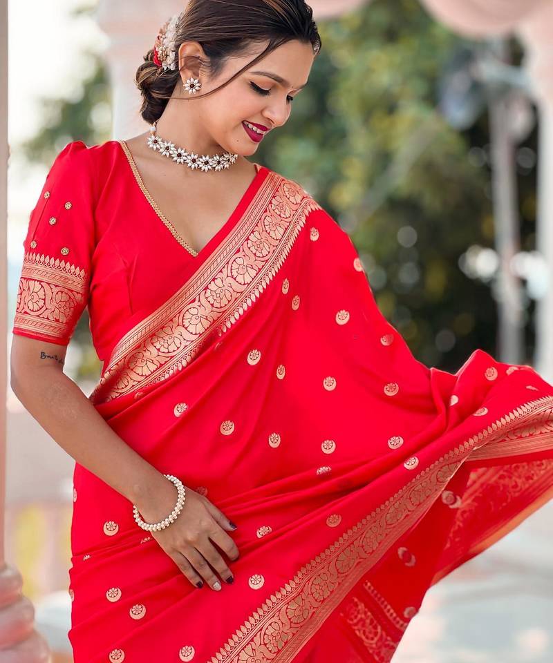 Red elegant art silk woven saree with rich zari border