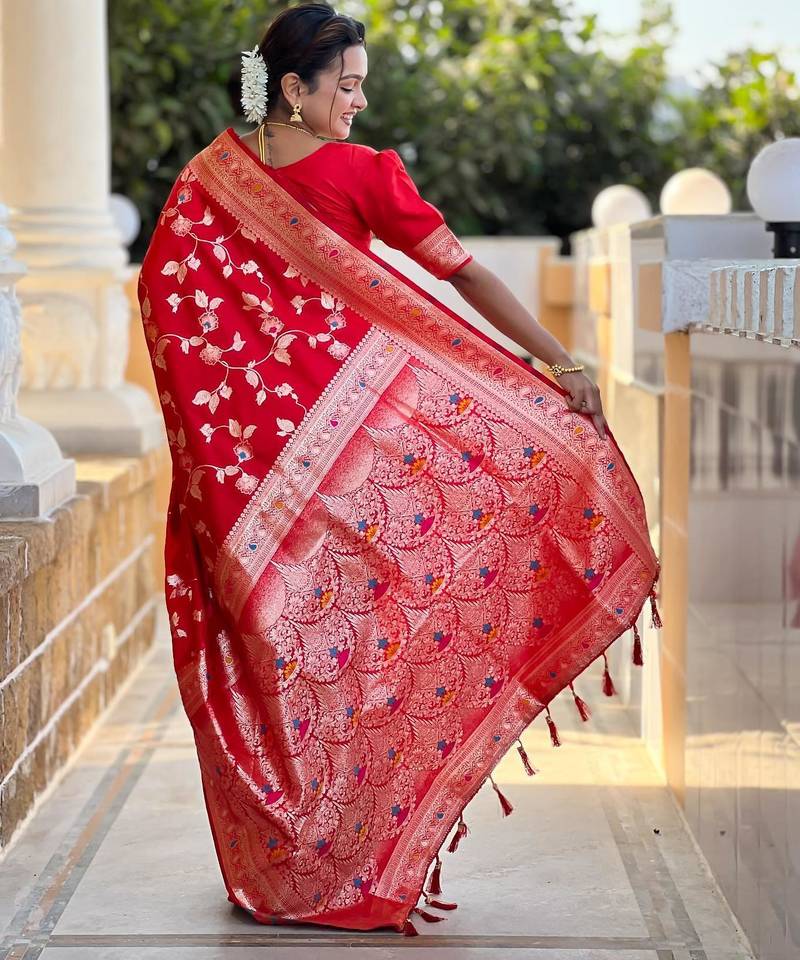| Product Description | Soft Banarasi Silk Saree With Zari Weaving Meenakari Touchup Design All Over The Saree & Meenakari Weawing Rich Pallu With Meenakari Weawing Border & Tessels Attached At Pallu End. Blouse : Soft Silk Weawing Blouse Piece |