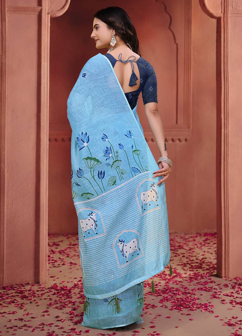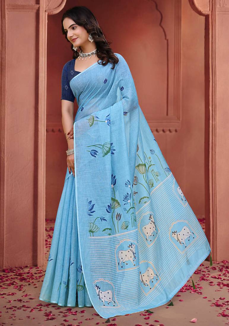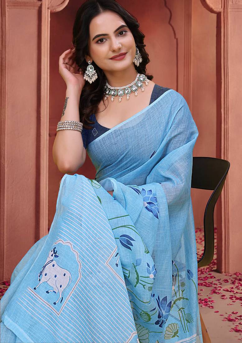 Sky blue printed art silk designer pallu saree