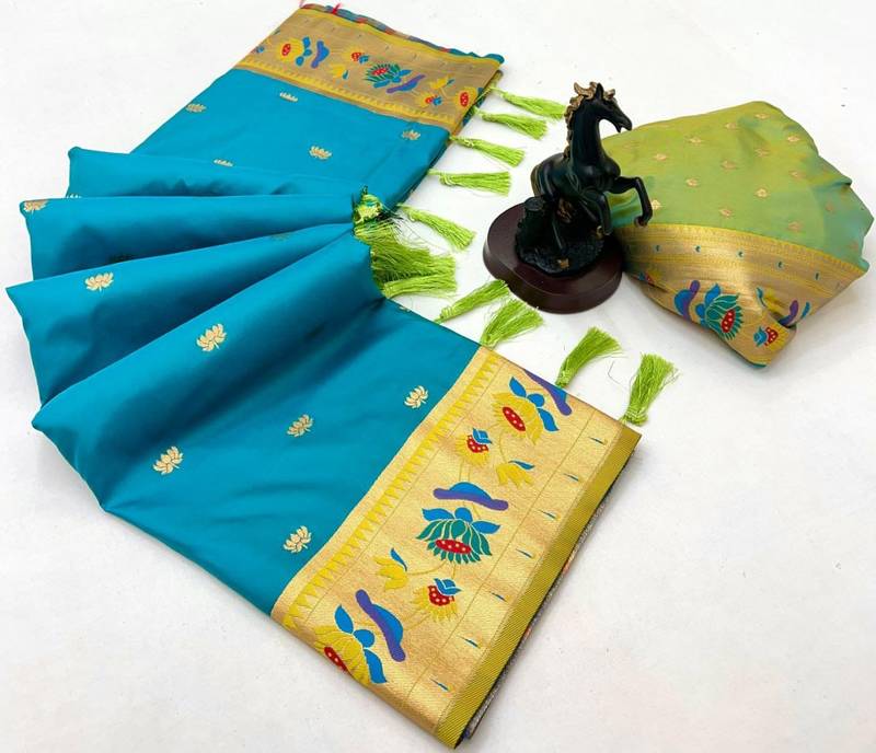 | Product Name | Sky Blue Soft Silk Paithani Saree With Lotus Zari Weaving & Meenakari Border | |