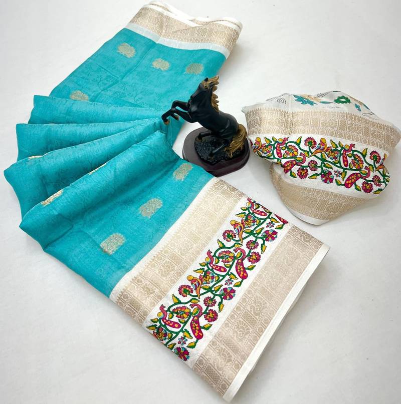 | Product Name | Sky Blue Soft Tussar Silk Saree With Zari Butti & Kashmiri Style Woven Border | |