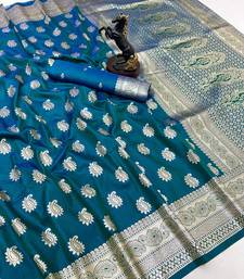 Teal banarasi silk saree with zari embossed mango design & rich pallu