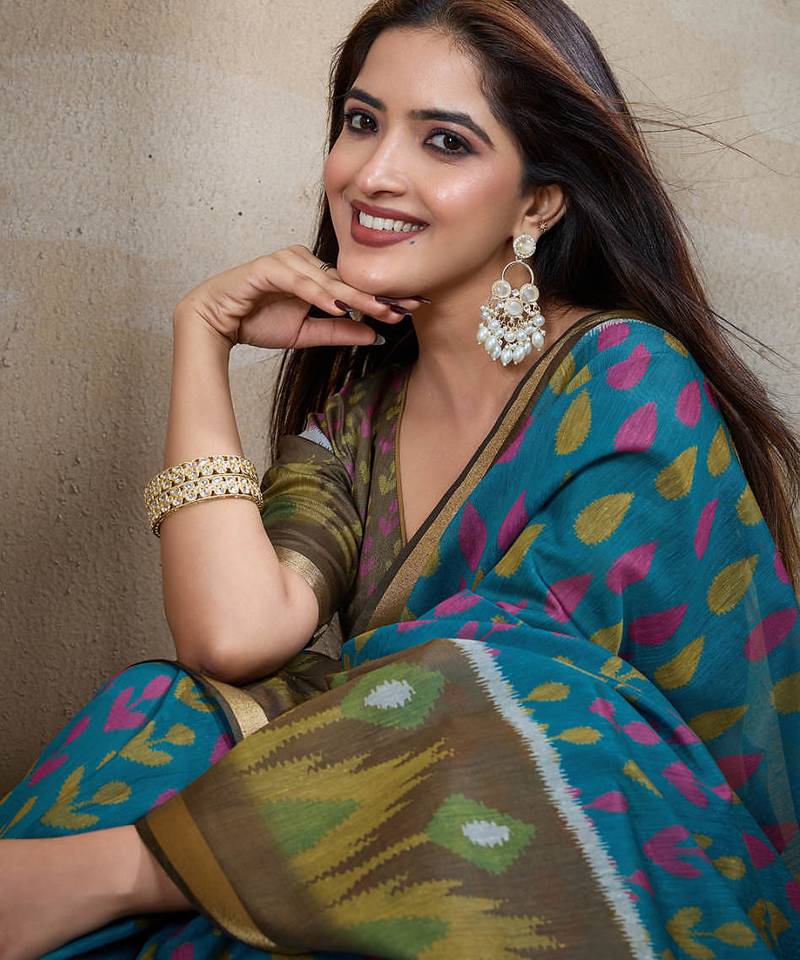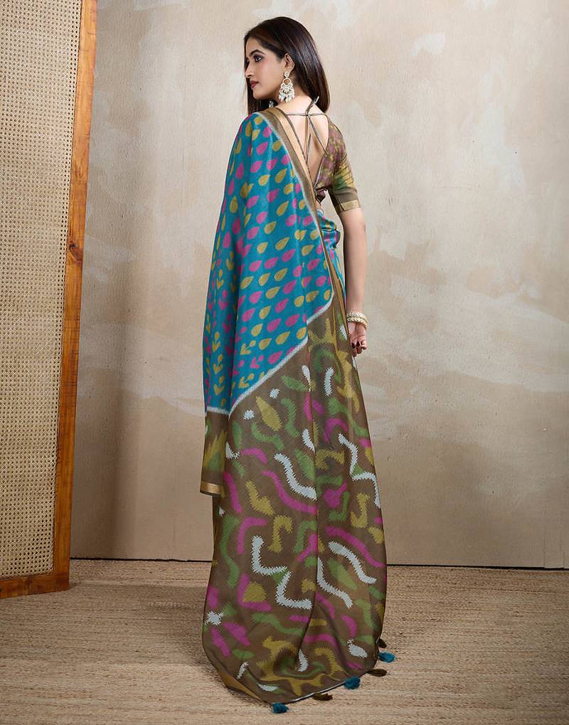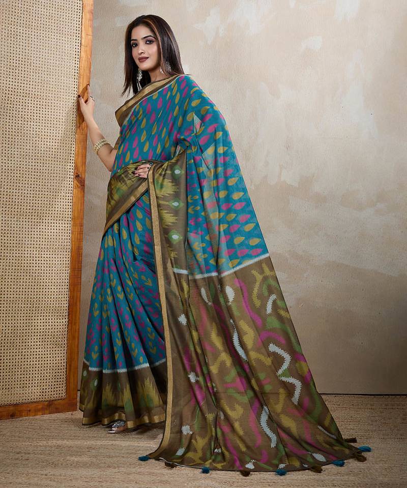 Teal printed art silk designer pallu saree