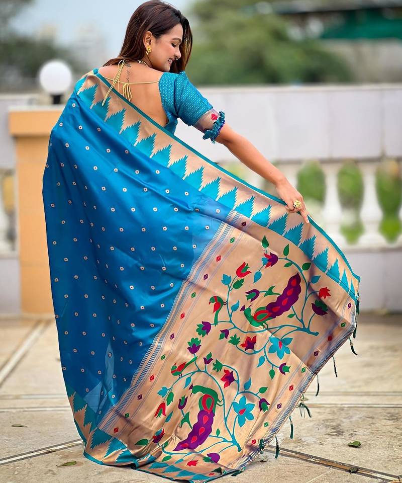 | Product Description | Soft Paithani Silk Saree With Zari Weawing Motifs Design And Meenakari Weawing Rich Pallu With Temple Weawing Border & Tassels Attached At Pallu End. Blouse : Enrich Silk Weawing Blouse Piece With Sleeve Border , |