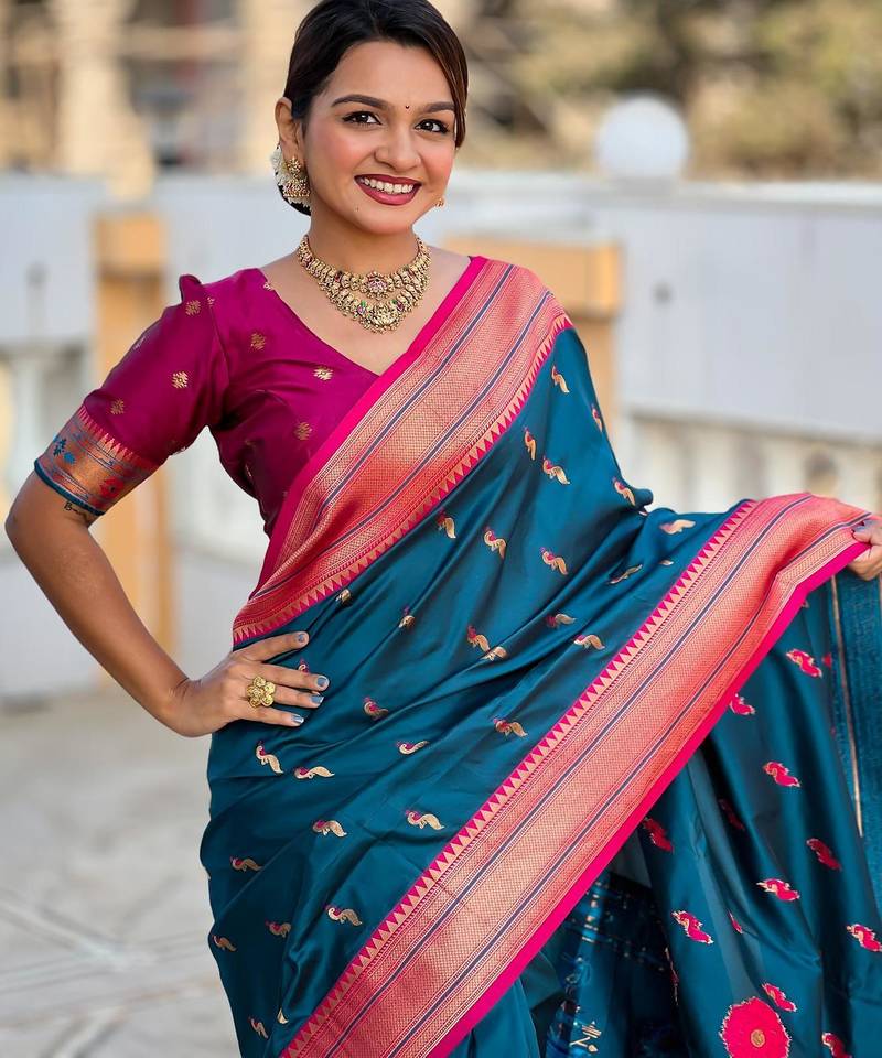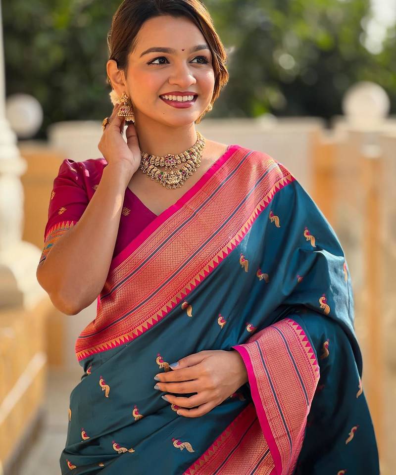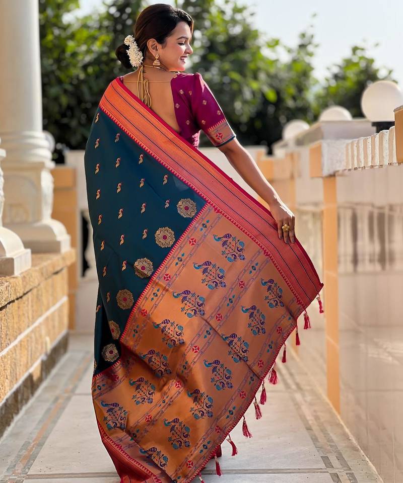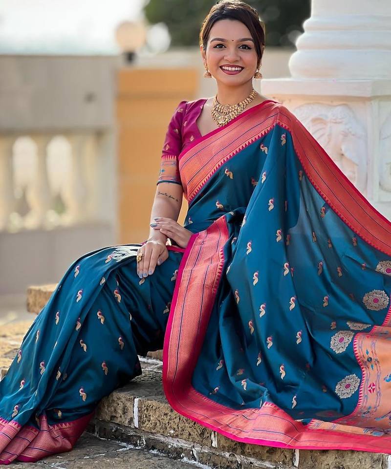 | Product Description | Soft Paithani Silk Saree With Zari Weawing Motifs Design And Meenakari Weawing Rich Pallu With Meenakari Weawing Border & Tassels Attached At Pallu End. Blouse : Enrich Silk Weawing Contrast Blouse Piece With Sleeve Border , |