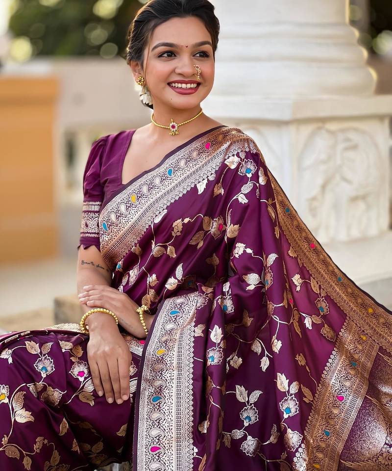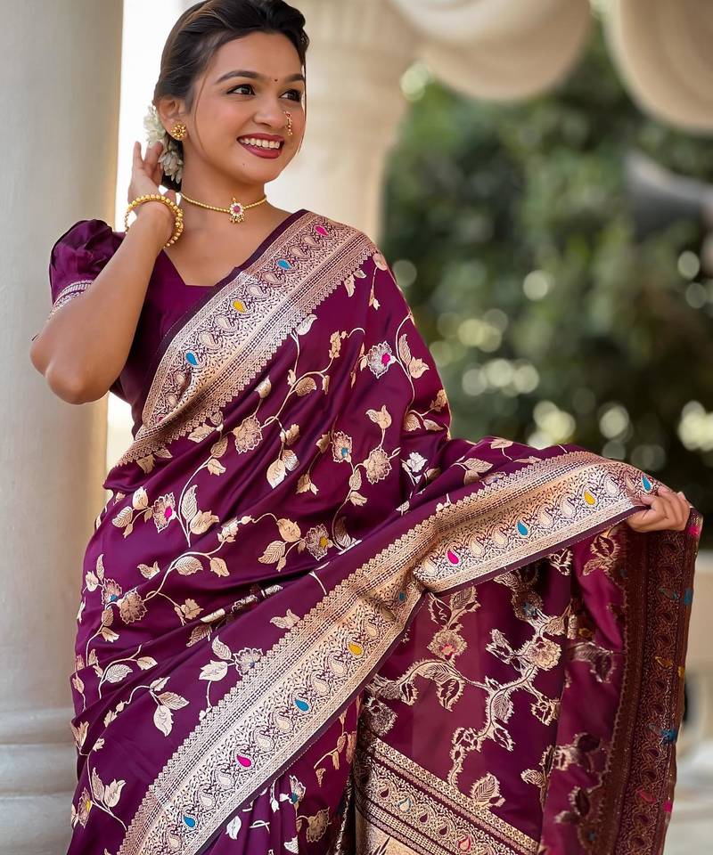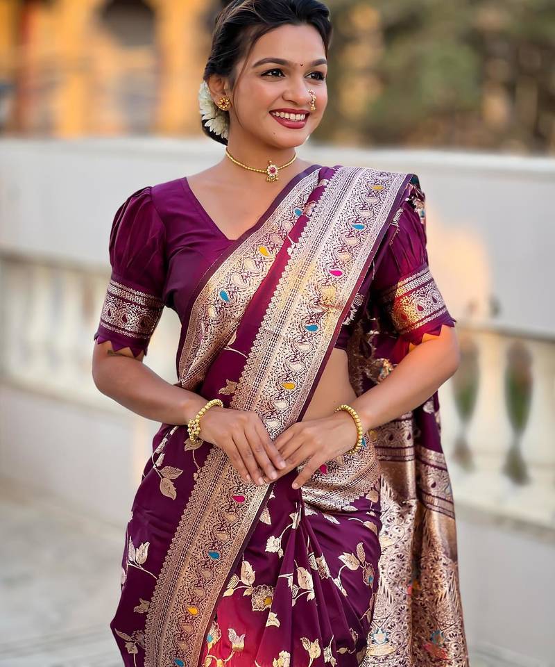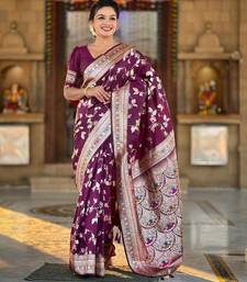 Wine elegant art silk woven saree with rich zari border