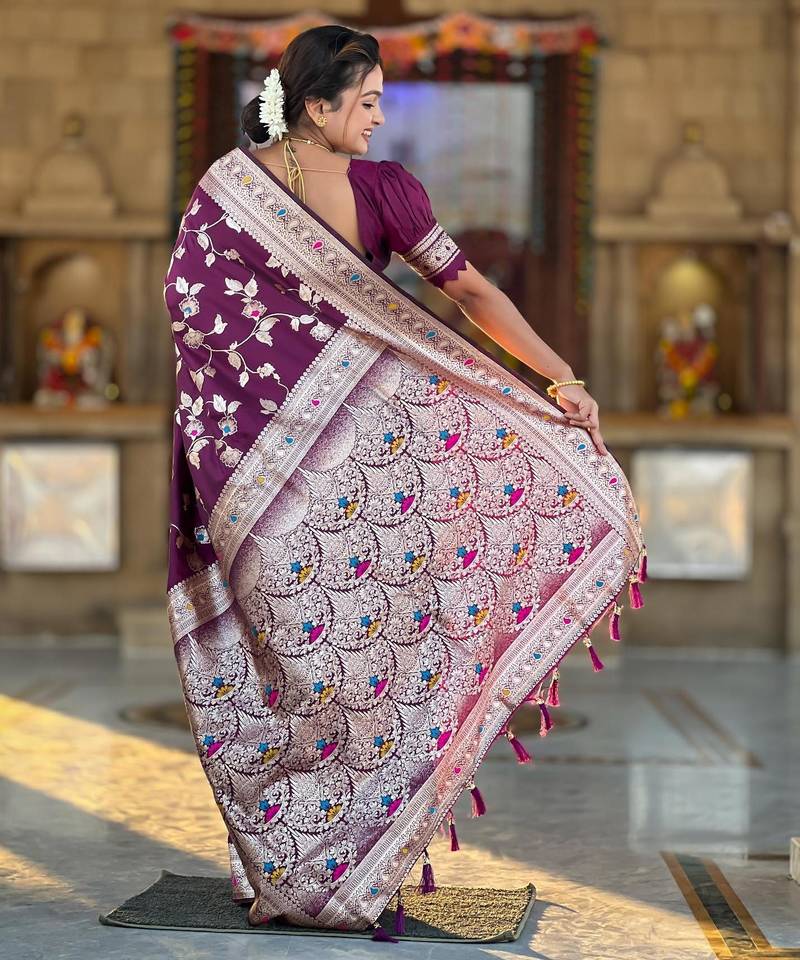 | Product Description | Soft Banarasi Silk Saree With Zari Weaving Meenakari Touchup Design All Over The Saree & Meenakari Weawing Rich Pallu With Meenakari Weawing Border & Tessels Attached At Pallu End. Blouse : Soft Silk Weawing Blouse Piece |