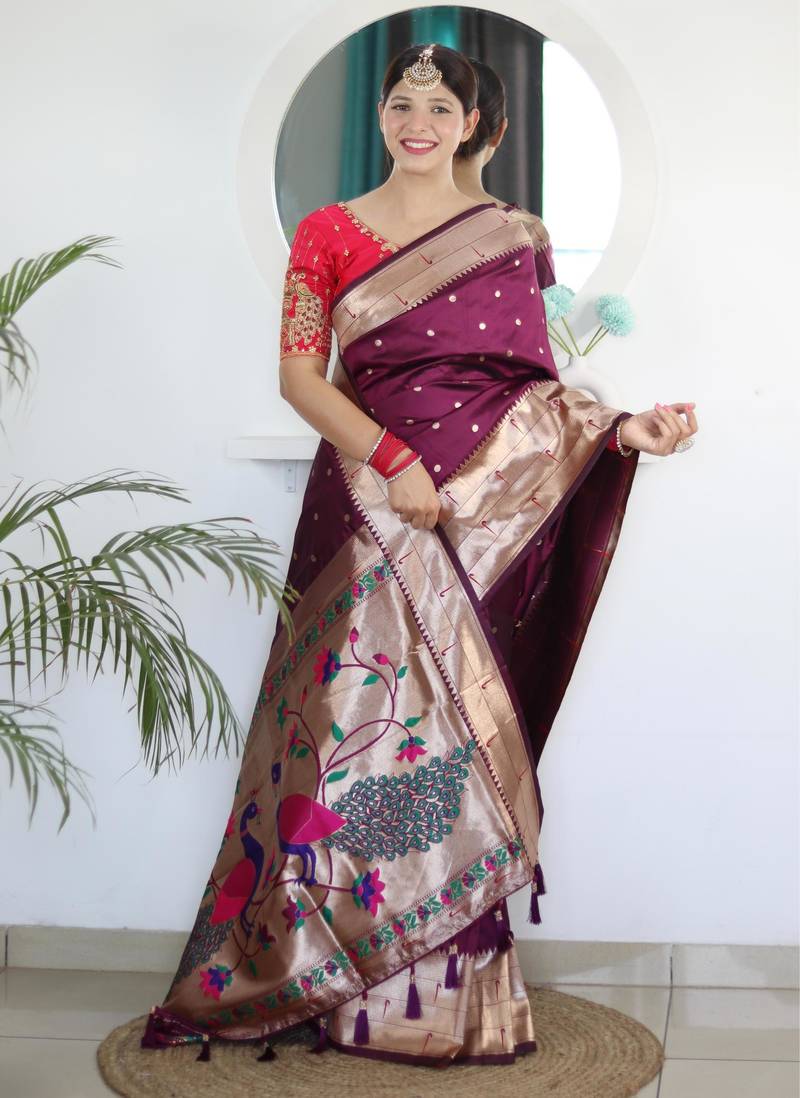 | Product Description | Soft Paithani Silk Saree With Zari Weawing Motifs Design And Meenakari Weawing Rich Pallu With Meenakari Weawing Border & Tassels Attached At Pallu End. Blouse : Enrich Silk Weawing Contrast Blouse Piece With Sleeve Border , |