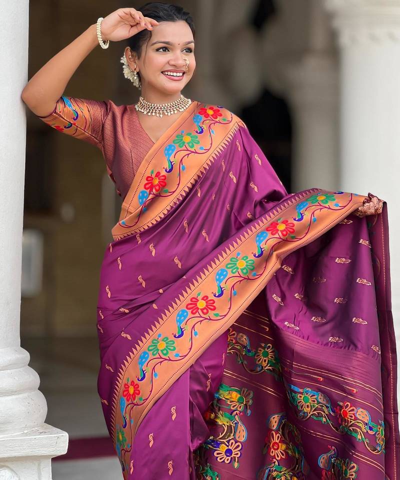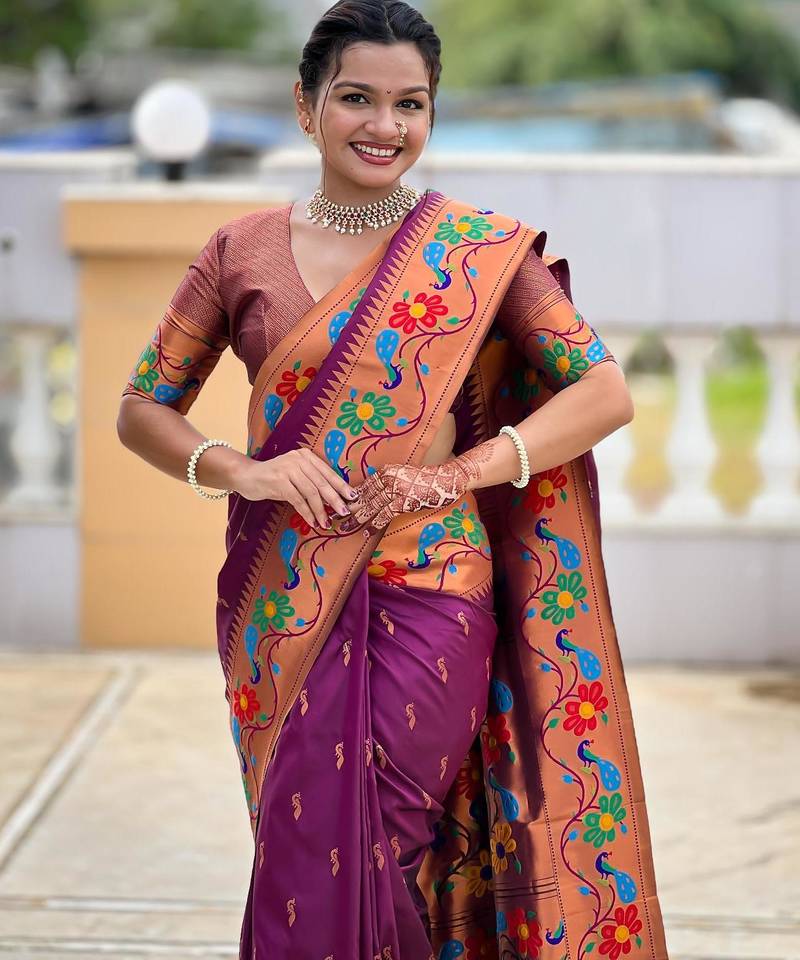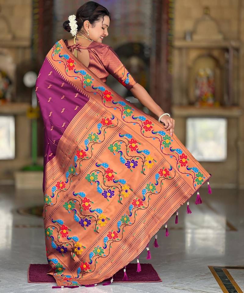 | Product Description | Soft Paithani Silk Saree With Zari Weawing Meenakari Motifs Design And Meenakari Weawing Rich Pallu With Meenakari Weawing Border & Tassels Attached At Pallu End. Blouse : Enrich Silk Weawing Contrast Blouse Piece With Sleeve Border , |