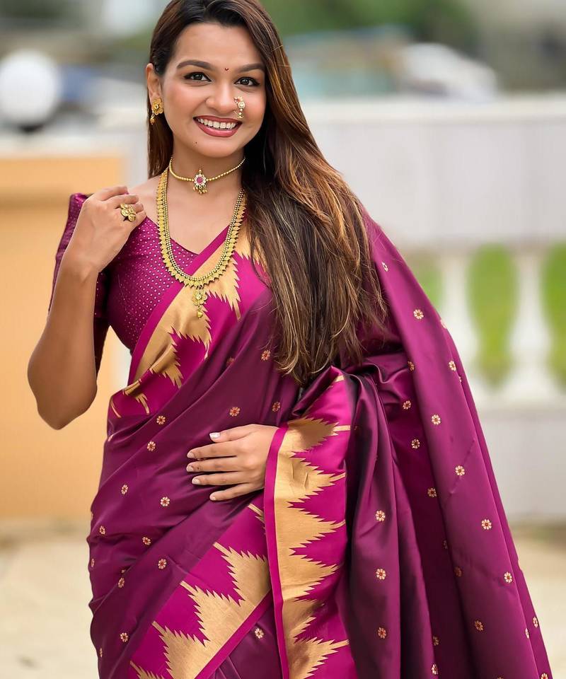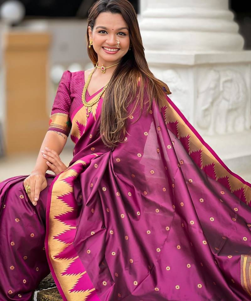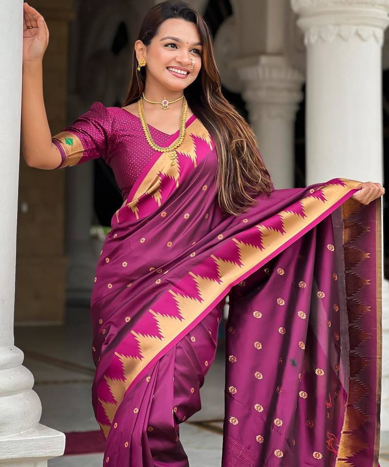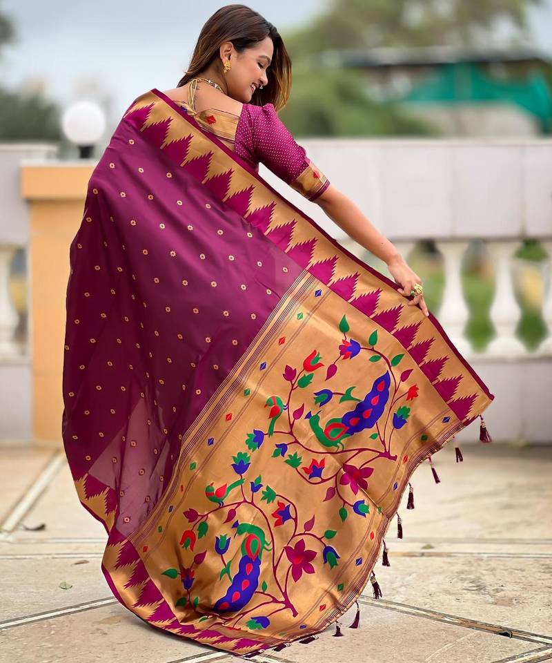 | Product Description | Soft Paithani Silk Saree With Zari Weawing Motifs Design And Meenakari Weawing Rich Pallu With Temple Weawing Border & Tassels Attached At Pallu End. Blouse : Enrich Silk Weawing Blouse Piece With Sleeve Border , |