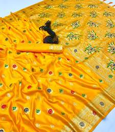 Yellow banarasi satin mashroo silk saree with multicolor zari motifs