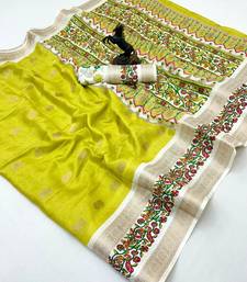 Yellow soft tussar silk saree with zari butti & kashmiri style woven border
