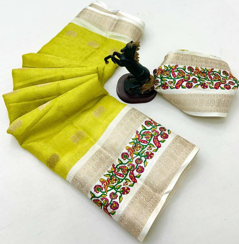 | Product Name | Yellow Soft Tussar Silk Saree With Zari Butti & Kashmiri Style Woven Border | |