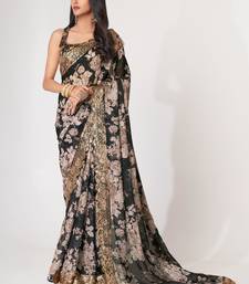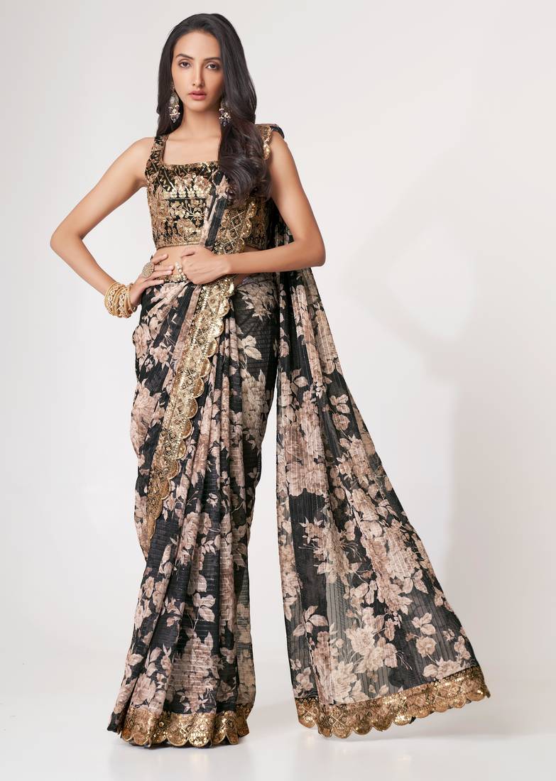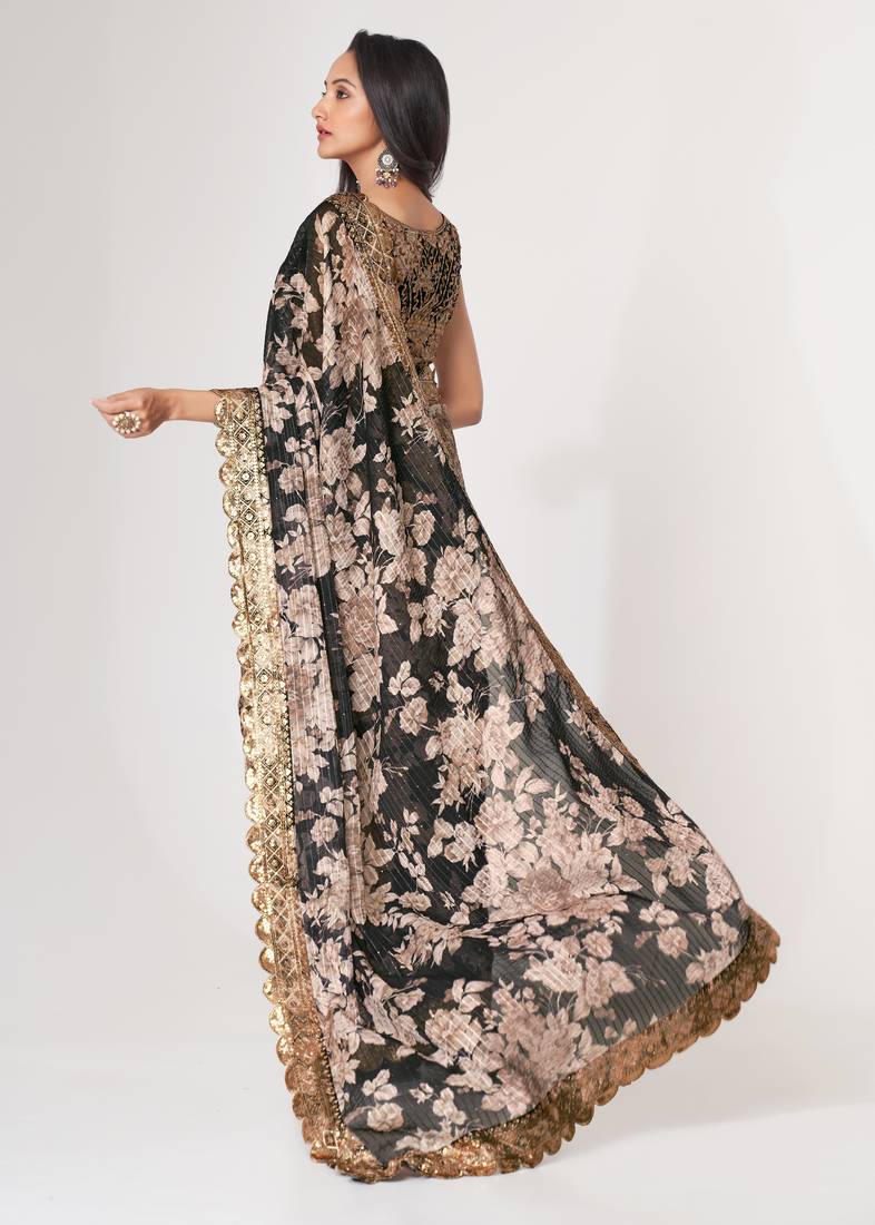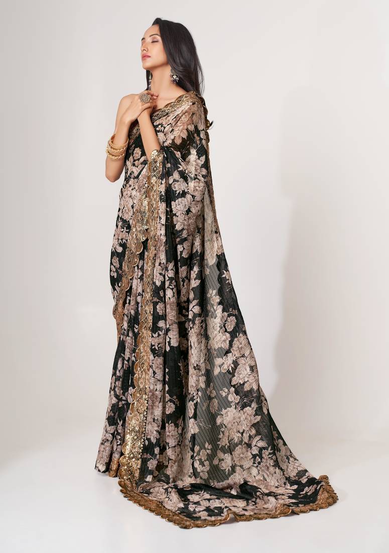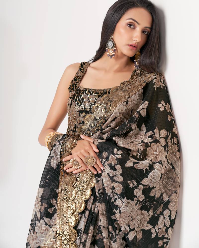 Black organza saree with sequins embroidery & floral digital print