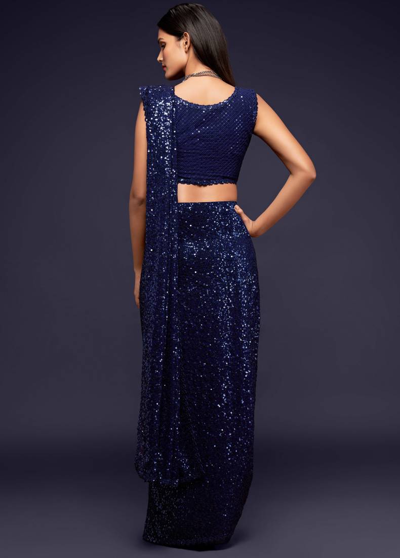 Navy blue georgette saree with thread & multiple sequins embroidery