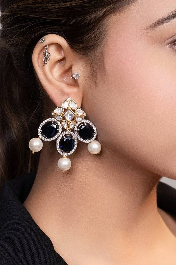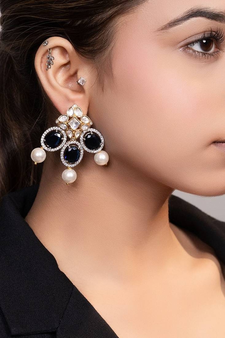 | Product Description | This Gold Plated Kundan Blue Stone Drop Earrings Showcase Vibrant Elegance And Traditional Craftsmanship. Crafted With A Radiant Gold Finish And Adorned With Kundan Work And Colorful Stones, They Add A Rich, Eye Catching Touch. Perfect For Festive Occasions, They Offer Graceful Movement And Timeless Ethnic Charm.