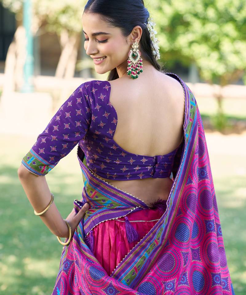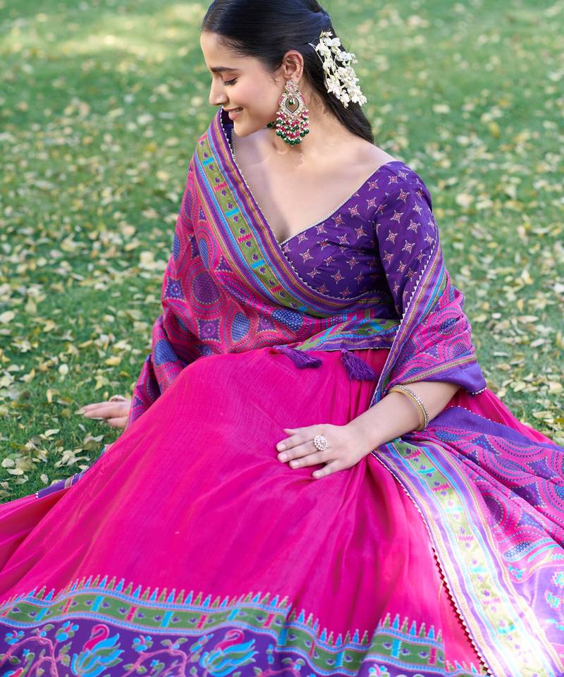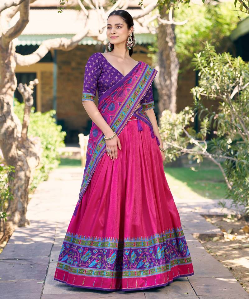 Designer tasar silk printed lehenga choli with iconic sparkle edition.
