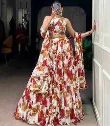 | Product Description | Brighten Your Festive Wardrobe With This White Marble Floral Printed Chaniya Choli. The Crisp White Base Is Beautifully Enhanced With Bold Red And Warm Orange Floral Prints, Creating A Vibrant And Eye Catching Look. The Stylish Halter Neck Choli Adds A Modern Touch, While The Multi Tier Flared Chaniya Offers A Soft, Flowy Silhouette That Moves Gracefully. The Coordinated Printed Dupatta Completes The Set, Making It Perfect For Women Who Prefer Lightweight, Comfortable, And Trendy Outfits For Celebrations. This Stitched Chaniya Choli Is An Ideal Pick For Haldi Functions, Festive Gatherings, Daytime Events, And Joyful Celebrations. |