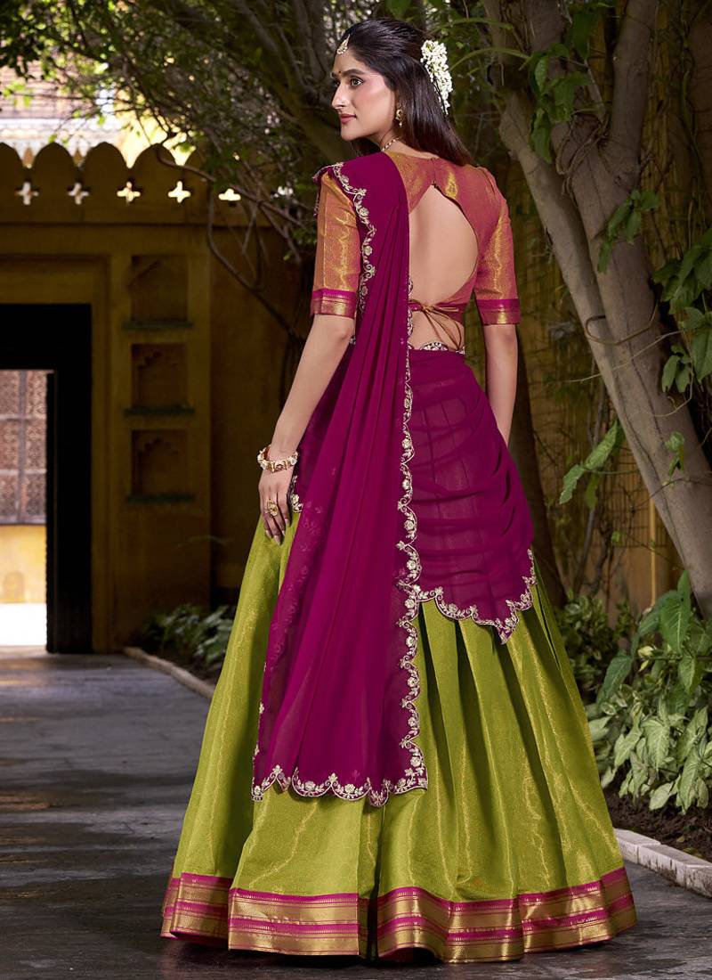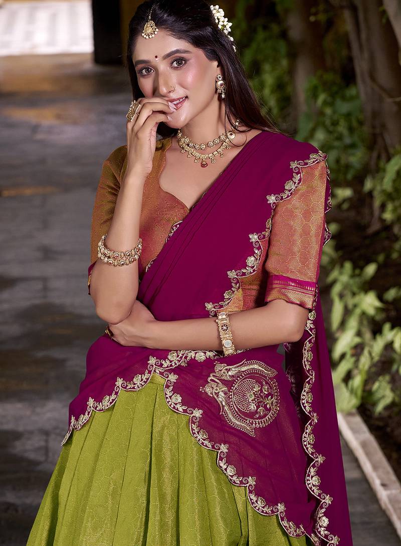 Green half saree lehenga with contrast blouse & dupatta – festive ethnic wear for women
