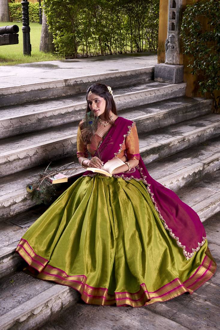 | Product Description | This Green Half Saree Lehenga Showcases A Richly Textured Skirt Paired With A Contrast Blouse And Embellished Dupatta. Designed With Fine Craftsmanship And Premium Fabric, It Delivers A Flattering Silhouette And Graceful Drape. Perfect For Festivals, Weddings, And Traditional Events, This Ensemble Reflects Timeless South Indian Style With Contemporary Appeal. Lehenga (Stitched)