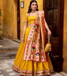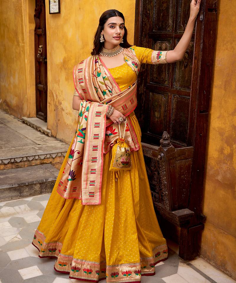 Yellow paithani silk chaniya choli with zari work