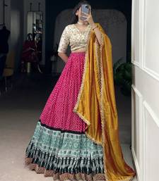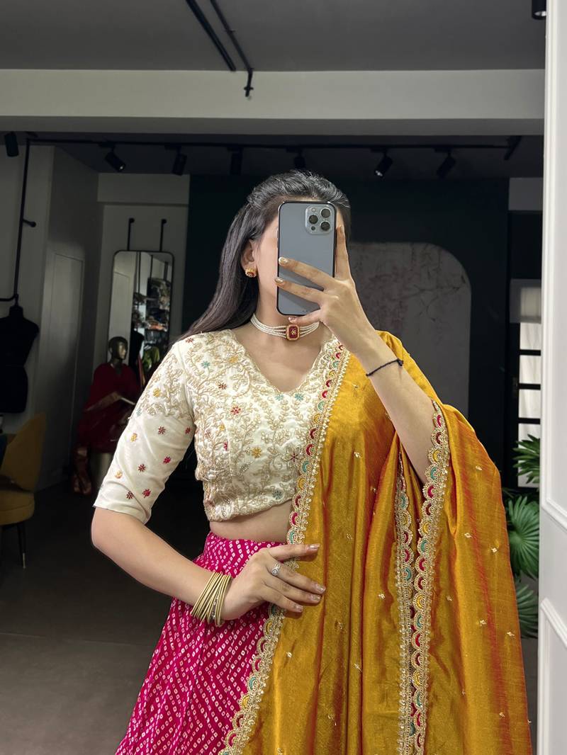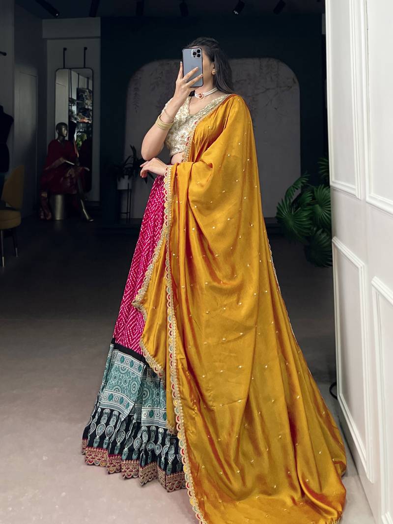 Rayon bandhej chaniya choli with sequins & thread embroidery lace