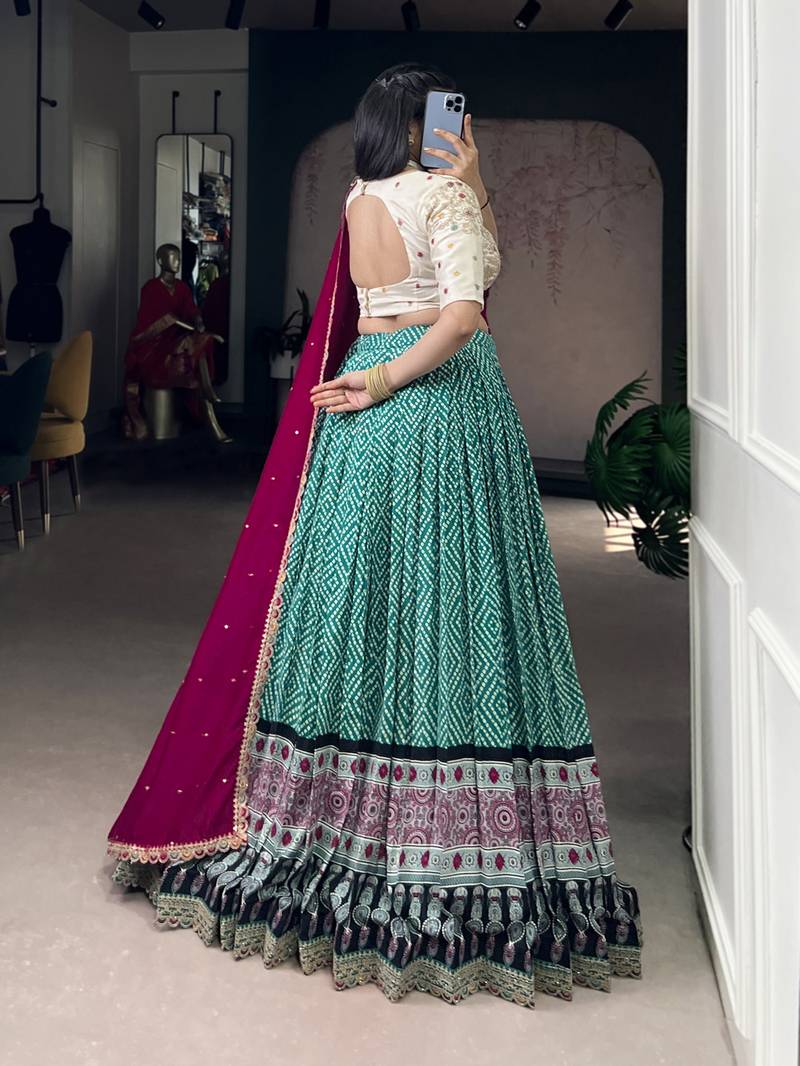 Rayon bandhej chaniya choli with sequins & thread embroidery lace