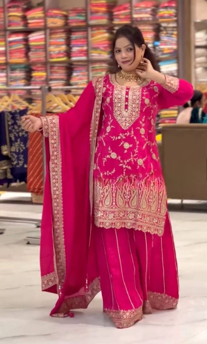 | Product Description | This Pink Sharara Suit Set Is Crafted From Chinon Silk, Known For Its Smooth Finish And Lightweight Texture. The Stitched Format Allows For Ready To Wear Convenience. The Sharara Bottom Provides A Wide, Flowing Silhouette That Enhances Movement. The Coordinated Design Creates A Balanced And Cohesive Outfit Suitable For Party Wear Use. Ideal For Festive Events, Evening Gatherings, And Celebrations, This Set Offers A Blend Of Traditional Structure And Modern Simplicity. |