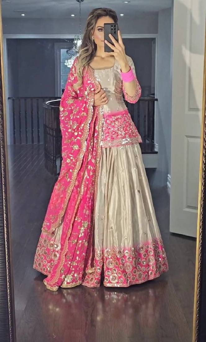 | Product Name | Pink Grey Chinon And Digital Print Embroidered Sharara Suit | |