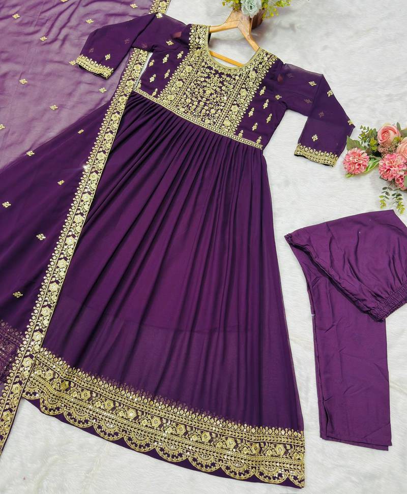 Wine soft georgette party wear embroidery suit set stitched