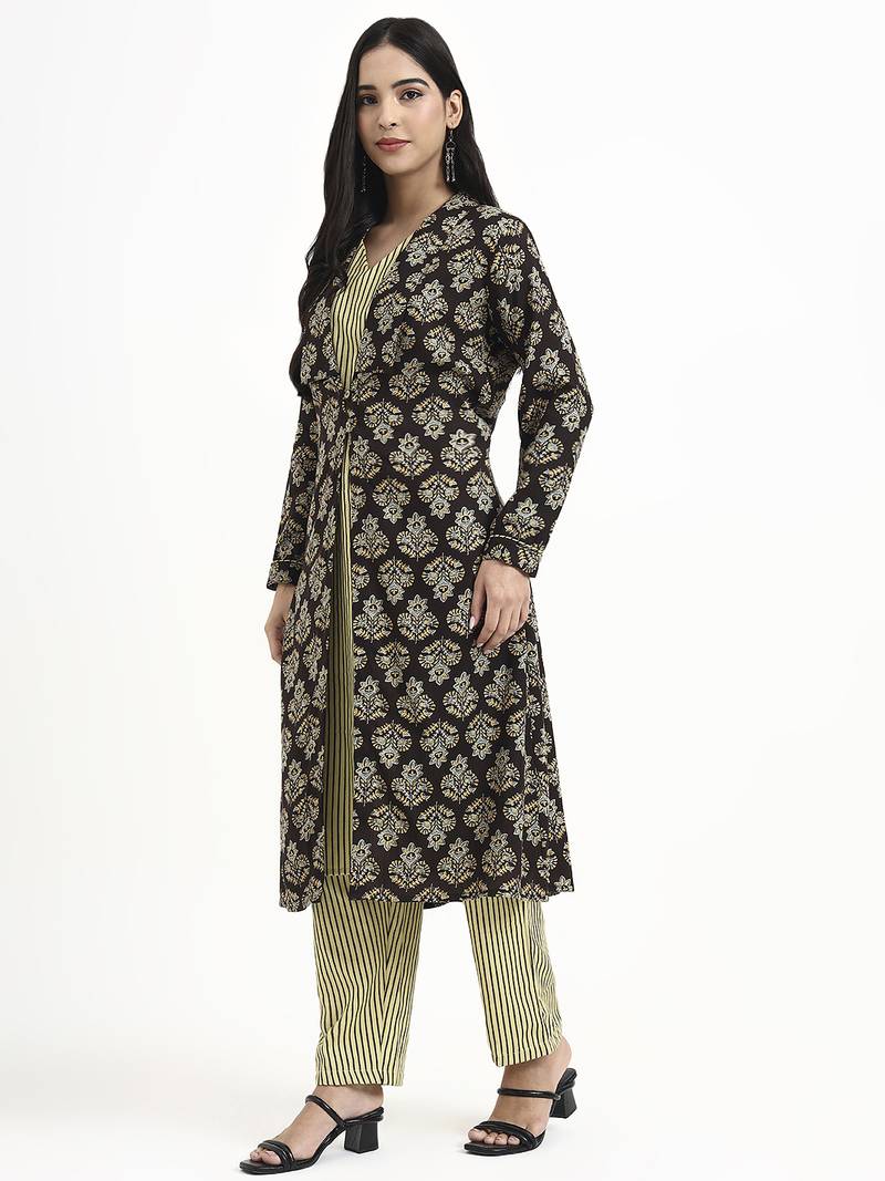 | Product Description | Black And Lime Green Printed Pure Cotton Straight Tunic Black Including Jacket Style Co Ord Set Design Wide Selection Of Black Floral Kurtas And Coordinating Sets, Including Jacket Style Options A Line Shape Long Sleeve V Neck Calf Length Kurta Straight Him Machine Weave Cotton Trouser Design:Printed Pure Cotton Trouser Elastic Waist Size & Fit Material & Care Pure Cotton Dry Clean |