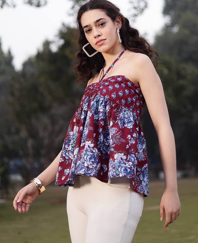 | Product Description | Maroon Cotton Floral Print Peplum Top Kurta Design Peplum Shape No Sleeves Halter Neck Hip Length Top Flared Him Machine Weave Slip On Waist Size & Fit Material & Care Pure Cotton |
