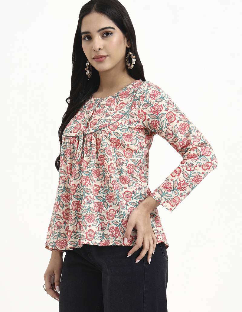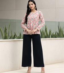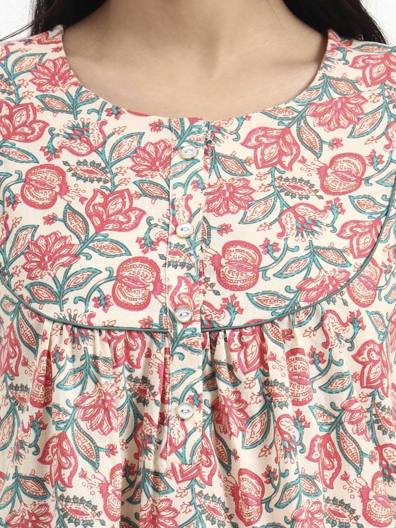 | Product Description | Cream And Pink Cotton Floral Print Peplum Top Kurta Design Piping Yuke Regular Shape Long Regular Sleeves Round Neck Hip Length Top Curved Him Machine Weave Botton Aist Size & Fit Material & Care Pure Cotton |