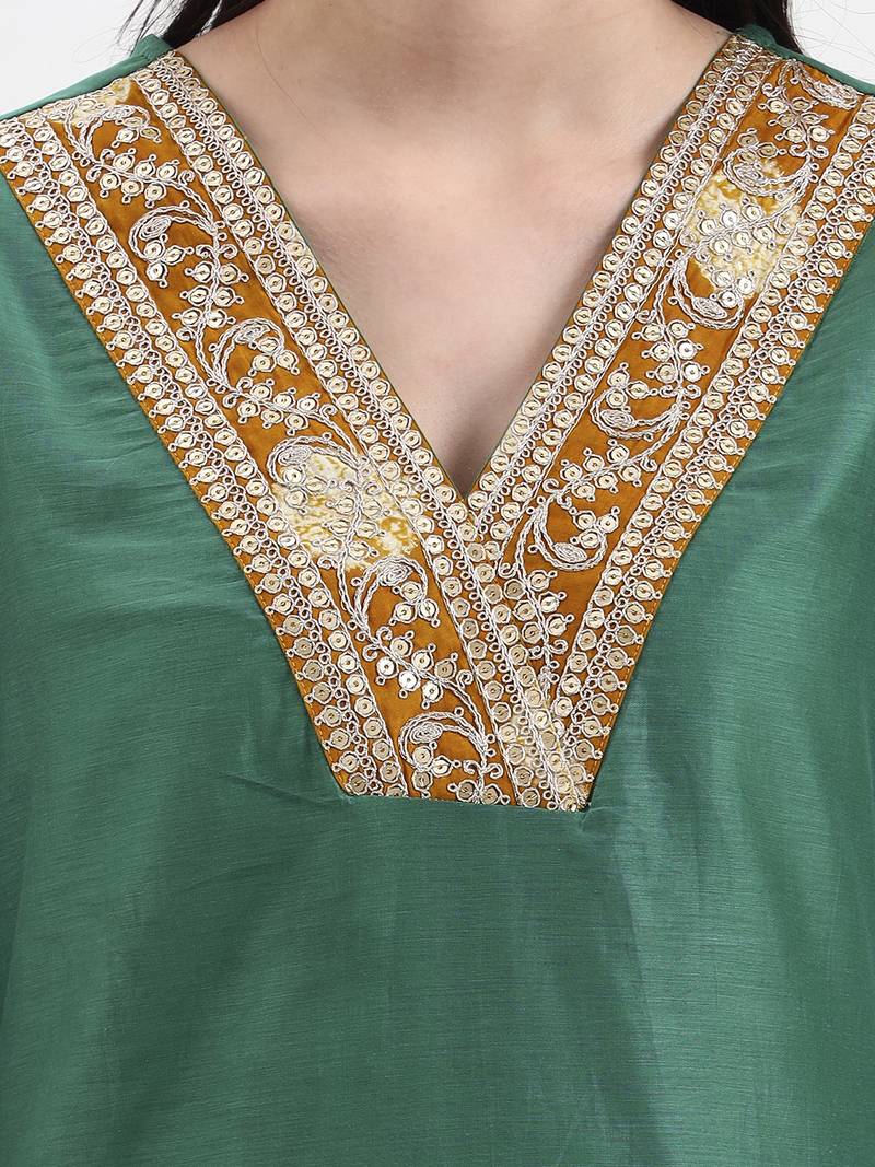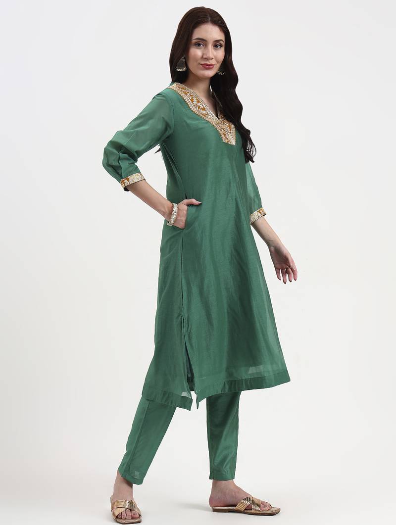 Product Description | Green Chanderi Cotton A Line Kurta Trouser Dupatta Set One Pocket Kurta Design Dori Embroidery Sequins Work A Line Shape Have A Lining Side Slits Three Quarter Sleeve Sleeves V Neck Calf Length Kurta Straight Him Machine Weave Silk Blend Trouser Design: Green Silk Blend One Pocket Trouser Slip On Waist Size & Fit Material & Care Chanderi Cotton |