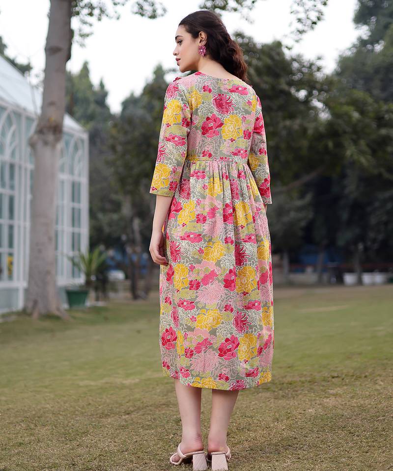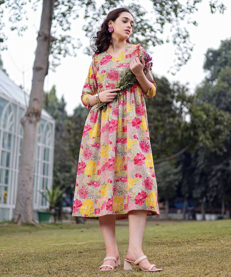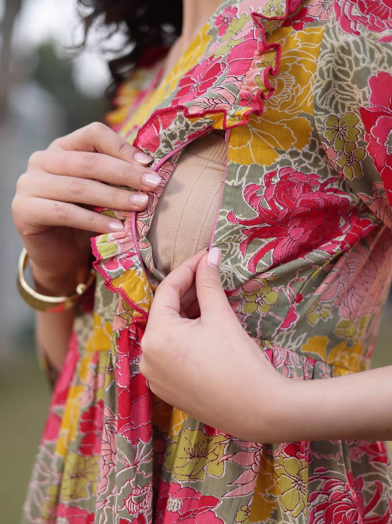 | Product Name | Green Cotton Floral Print Gathered Or Pleated Materinty Dress | |