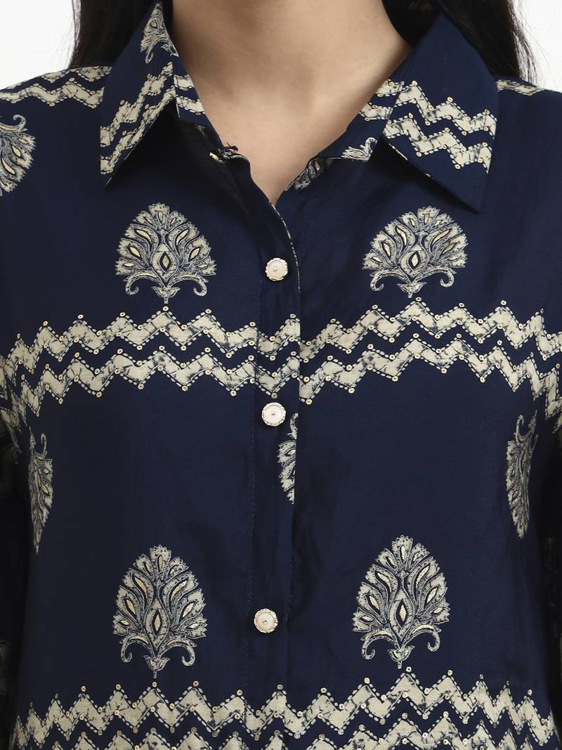 | Product Description | Navy Blue Cotton Ethnic Print Kaftan Top Kurta Design Multi Slits Kaftan Shape No Sleeves Shrit Collor Thigh Length Top Flared Him Machine Weave Slip On Waist Size & Fit Material & Care Pure Cotton |