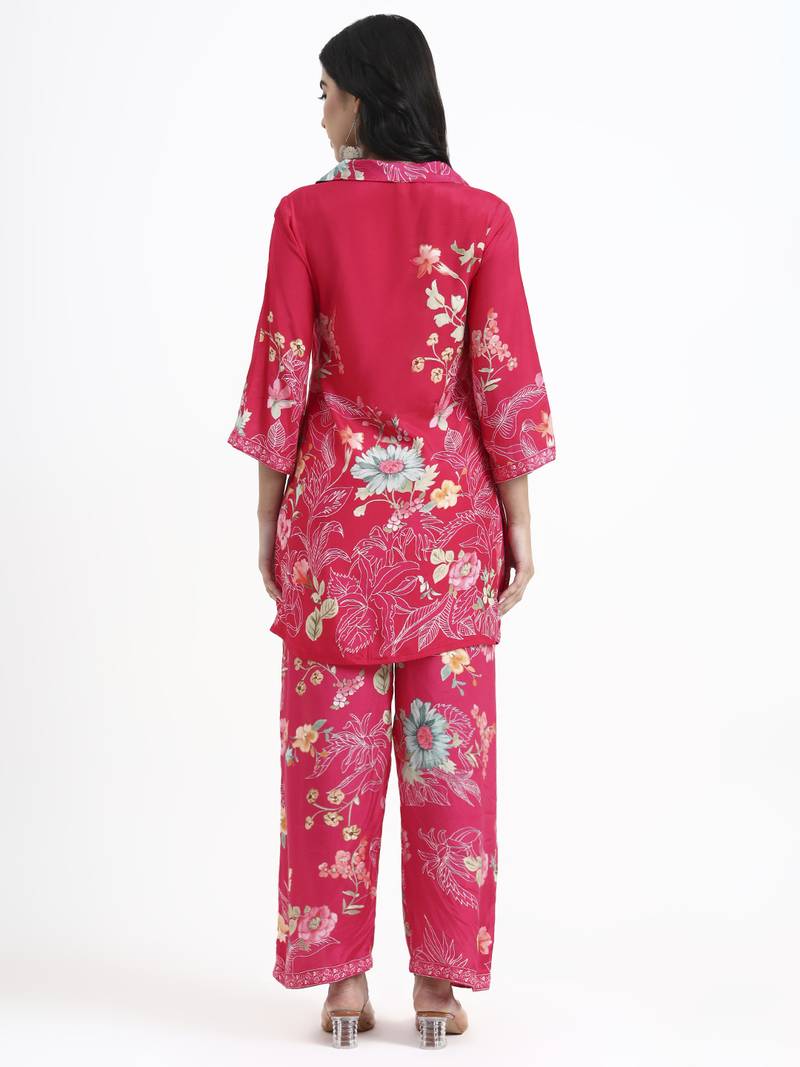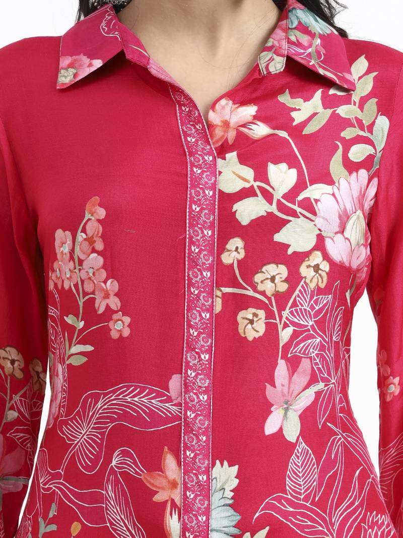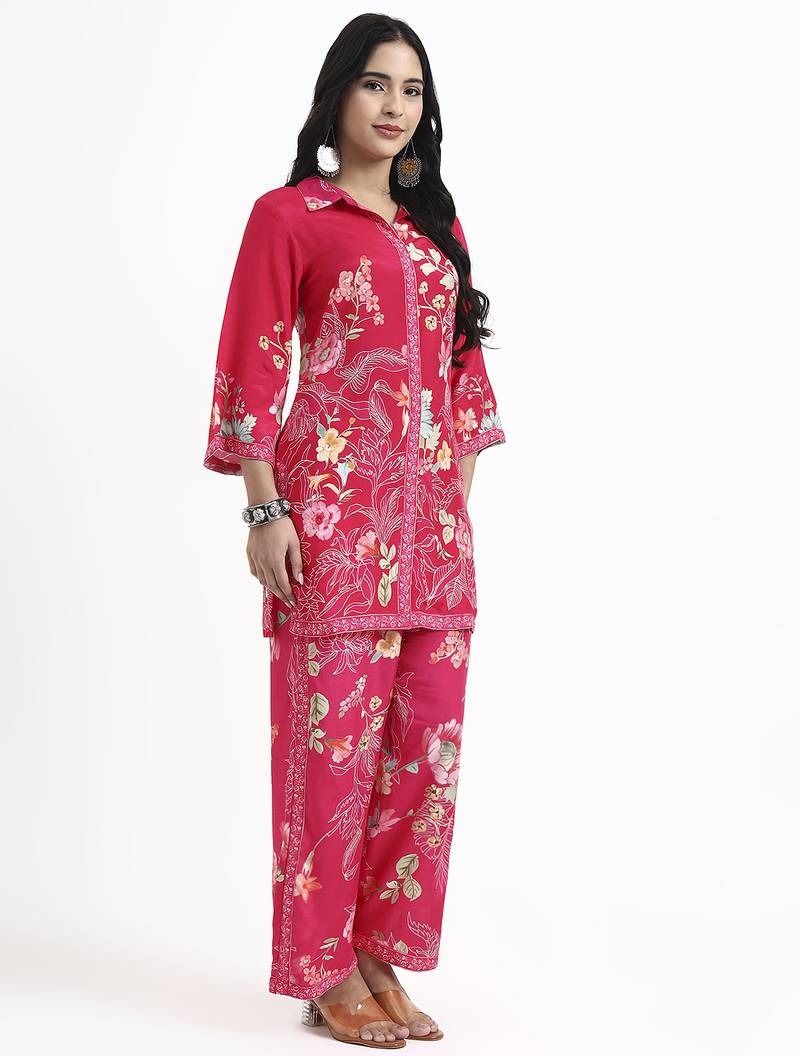 | Product Description | Pink Floral Print Straight Silk Blend Co Ord Set Design Floral Print A Line Shape Three Quarter Flared Sleeves Shirt Collar Thigh Length Kurta Straight Him Machine Weave Silk Blend Trouser Design:Floral Print Silk Blend Trouser Elastic Waist Size & Fit Material & Care Silk Blend Dry Clean |
