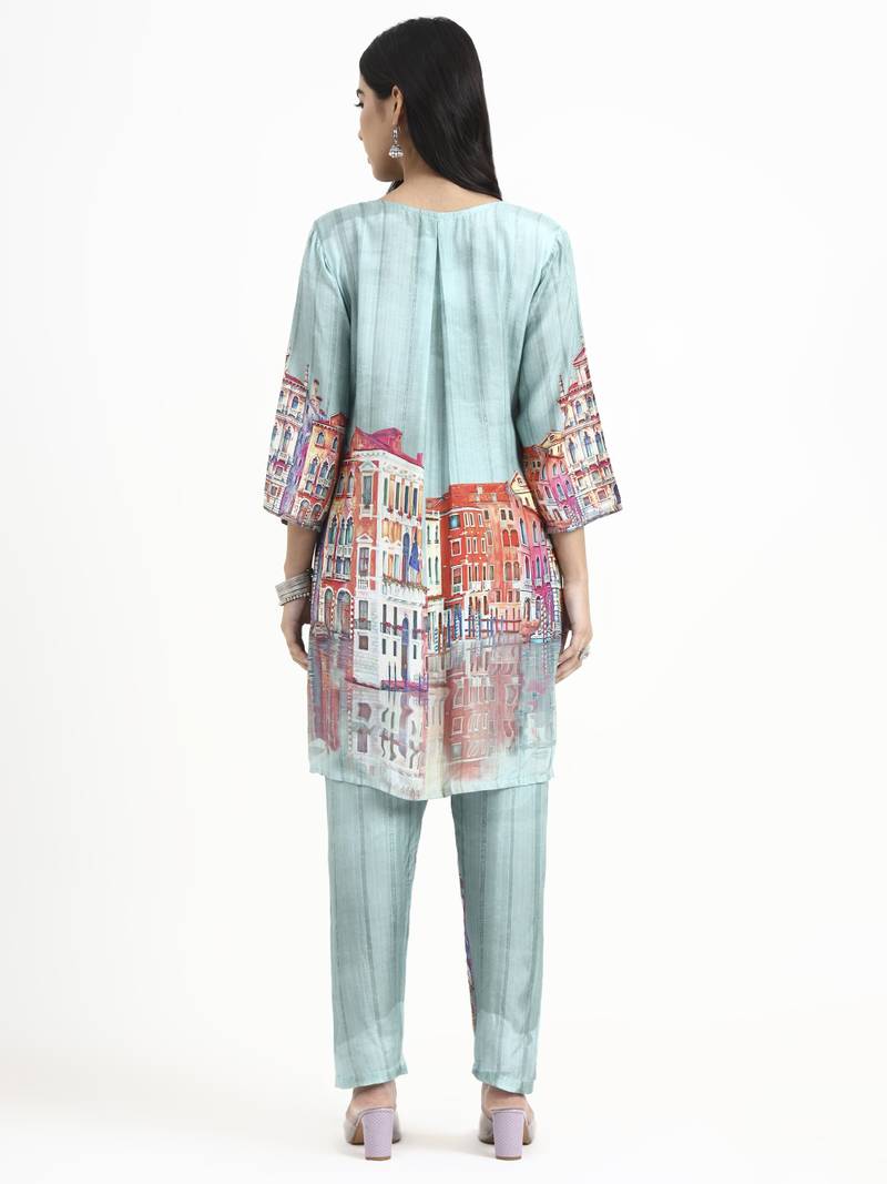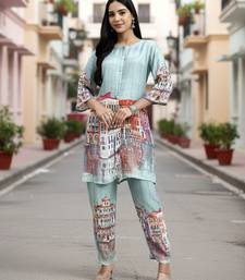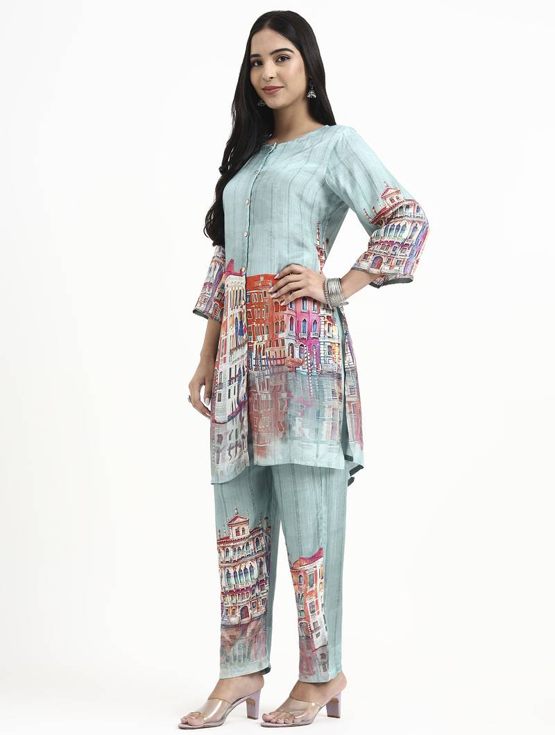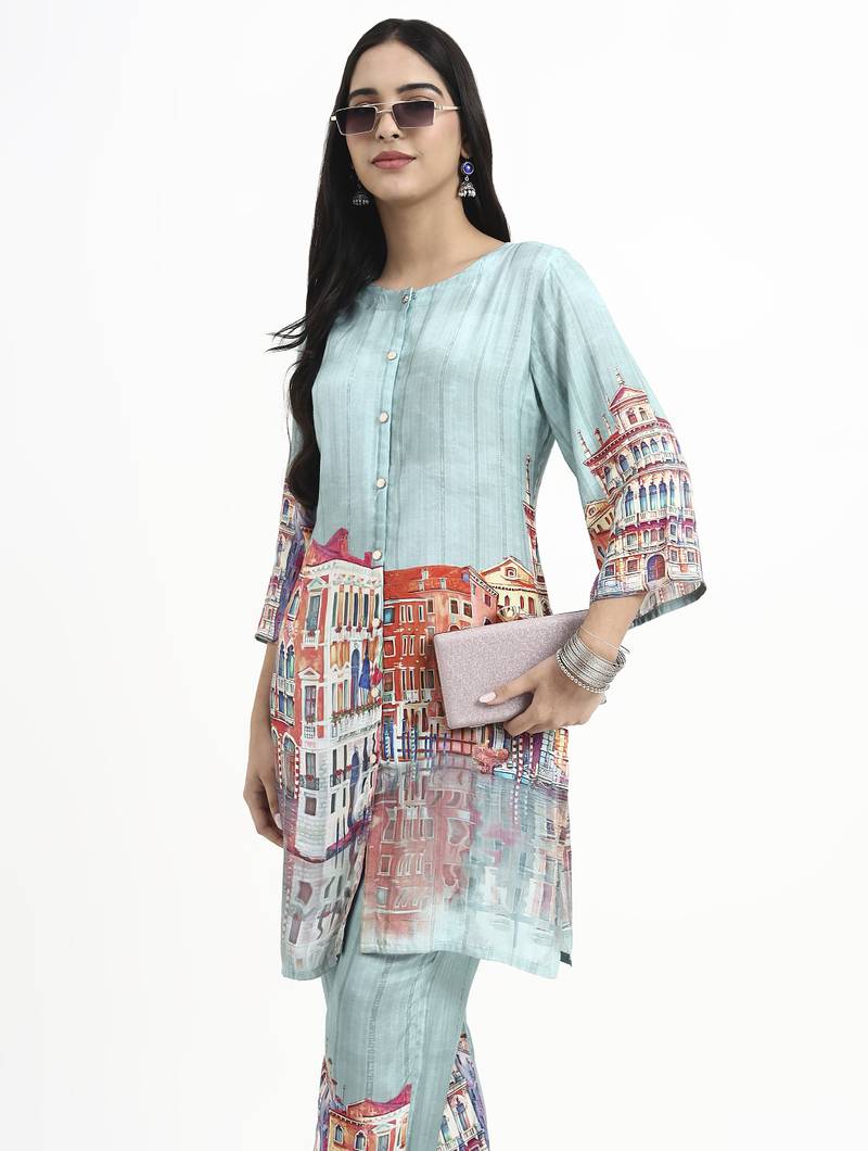 | Product Name | Turquoise Blue Digtal Print Straight Muslin Co Ord Set | |