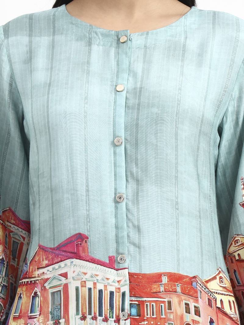 | Product Description | Turquoise Blue Digtal Print Silk Blend Co Ord Set Design A Line Shape Front Open Three Quarter Regular Sleeves Round Neck Knee Length Kurta Straight Him Machine Weave Silk Blend Trouser Design:Digtal Print Silk Blend Trouser Elastic Waist Size & Fit Material & Care Silk Blend Dry Clean |