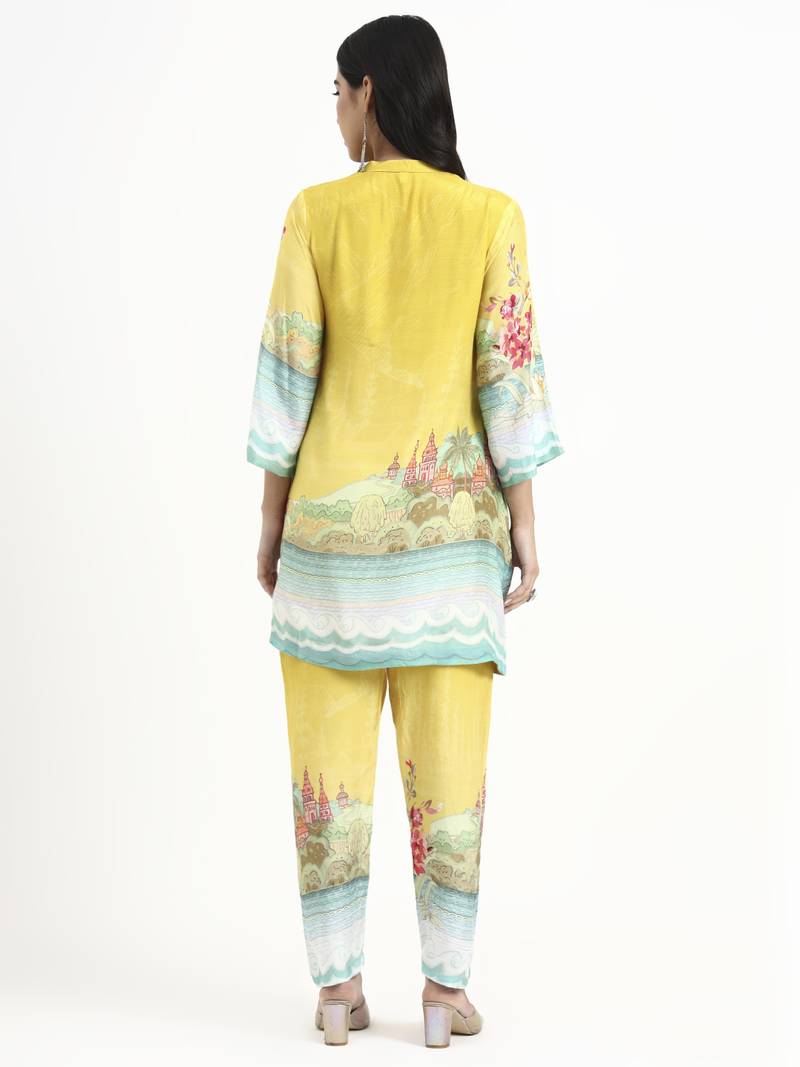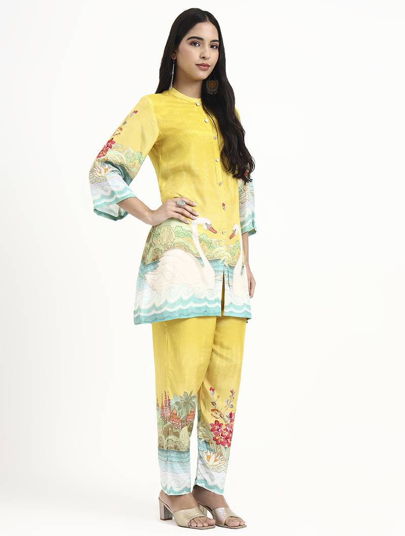 yellow digtal print straight muslin co-ord set