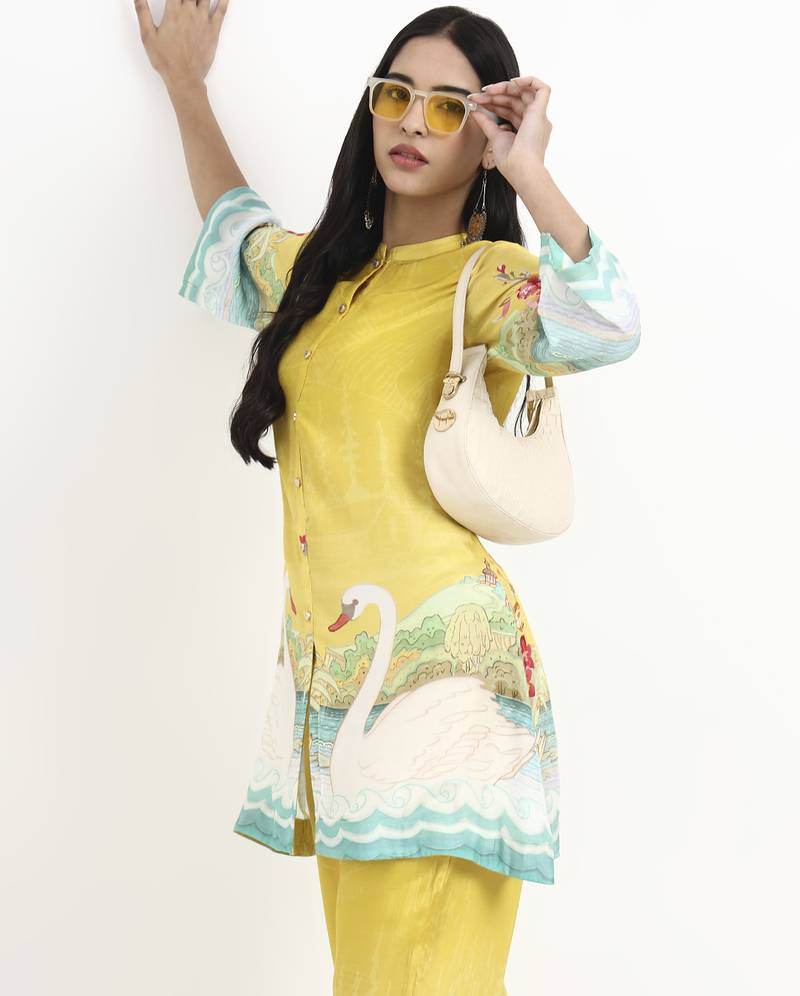 | Product Description | Yellow Digtal Print Straight Silk Blend Co Ord Set Design A Line Shape Front Open Three Quarter Regular Sleeves Mandarin Collar Knee Length Kurta Straight Him Machine Weave Silk Blend Trouser Design:Digtal Print Silk Blend Trouser Elastic Waist Size & Fit Material & Care Silk Blend Dry Clean |