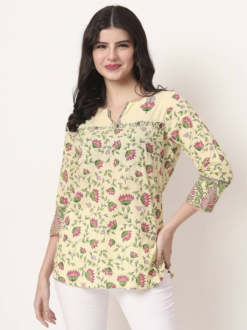 | Product Description | Yellow Cotton Floral Print Peplum Detailing ,Peplum Shape Round Neck Three Quarter Sleeve Curved Hem, Above Kneeh Size & Fit Material & Care Cotton Hand Wash |