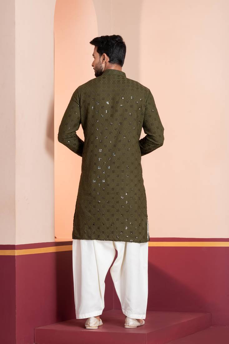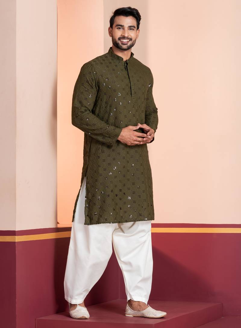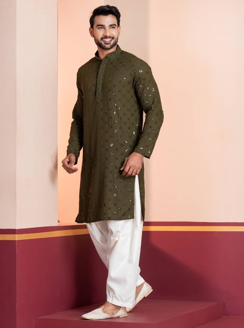 Olive embroidery sequence kurta for festive, reception, weddings