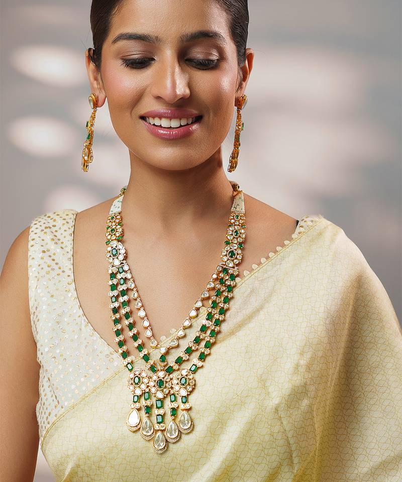 | Product Description | This Gold Plated Kundan Green Stone Layered Necklace Set Showcases Regal Elegance And Traditional Artistry. Featuring Beautifully Layered Strands Adorned With Vibrant Green Stones, It Reflects Intricate Craftsmanship And A Radiant Finish. Perfect For Weddings, Festive Occasions, Or Celebrations, It Adds Rich Color, Luxurious Depth, And Timeless Sophistication To Ethnic Ensembles.