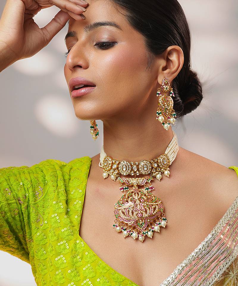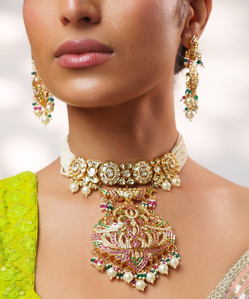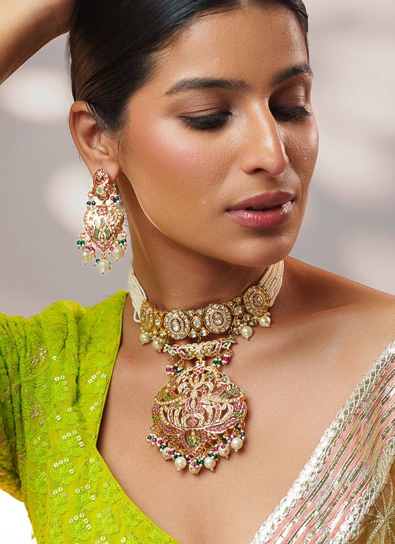 | Product Description | This Gold Plated Kundan Multicolor Stone Choker Necklace Set Exudes Vibrant Elegance And Regal Charm. Adorned With Intricately Set Multicolor Stones, It Showcases Exquisite Craftsmanship And A Radiant Finish. Perfect For Weddings, Festive Occasions, Or Special Celebrations, It Adds A Luxurious, Eye Catching Touch To Any Traditional Ensemble.