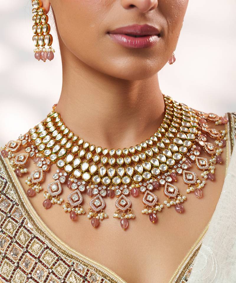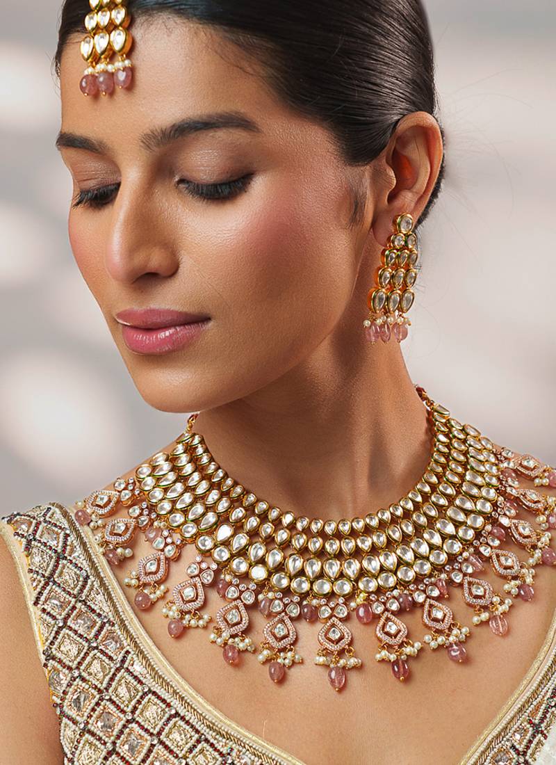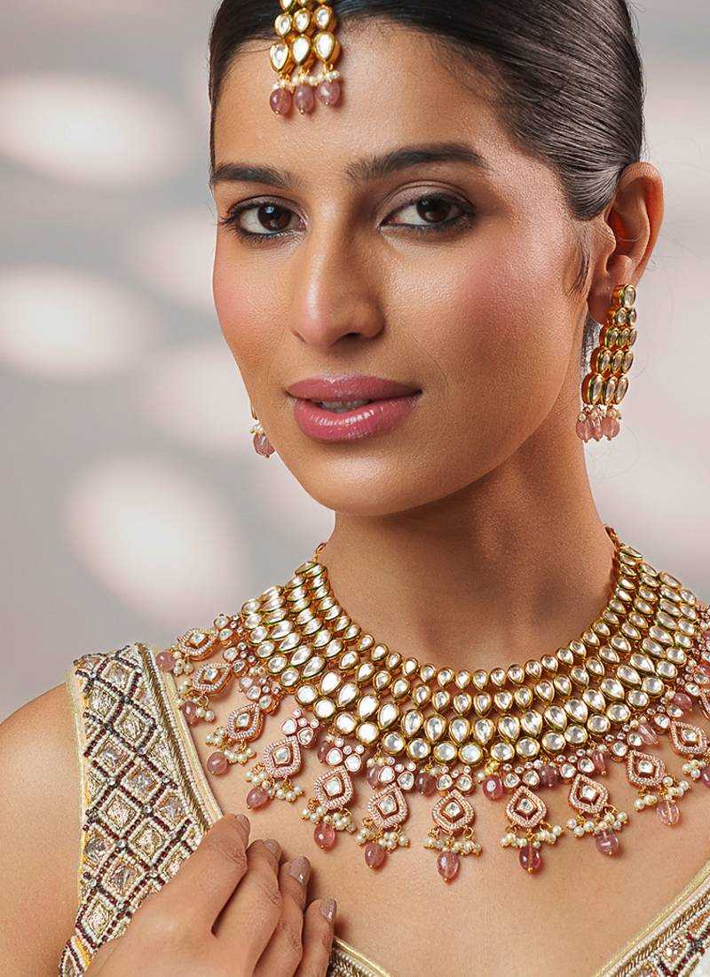 | Product Description | This Gold Plated Kundan Pink Stone Necklace Set Radiates Feminine Elegance And Timeless Charm. Adorned With Delicately Set Pink Stones, It Features Intricate Craftsmanship And A Luminous Finish. Perfect For Weddings, Festive Occasions, Or Special Celebrations, It Adds A Soft Pop Of Color And Luxurious Sophistication To Any Traditional Ensemble.